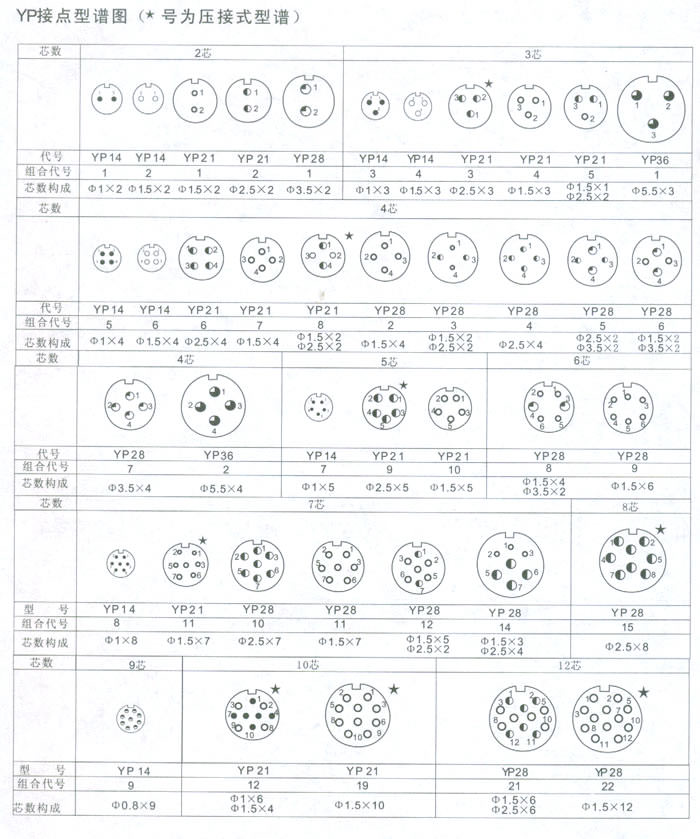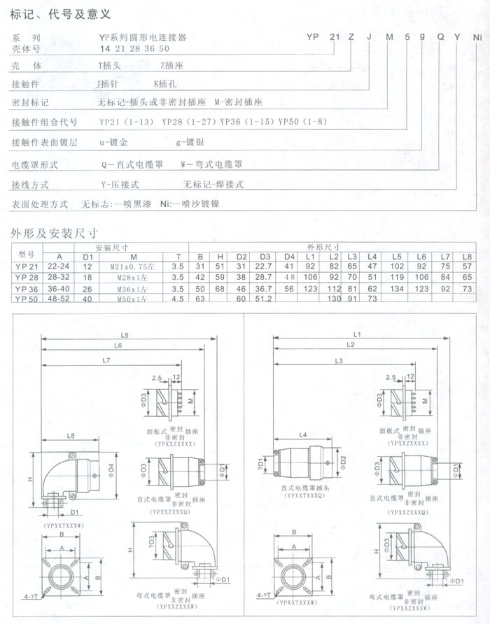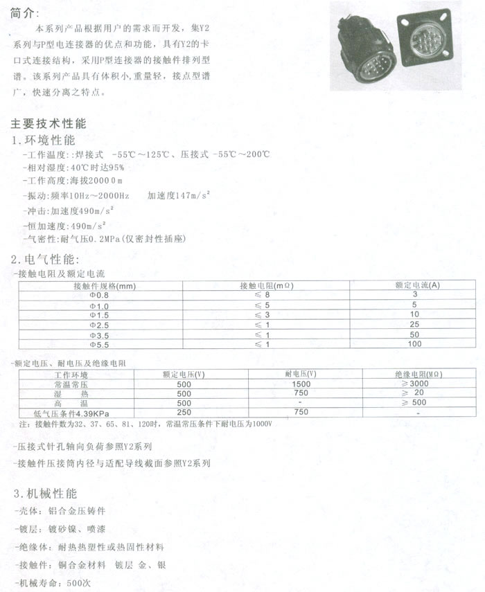 一、YP系列圓形電連接器(航空插頭)簡介 本系列航空插頭根據用戶的需求而開發,集Y2系列與P型電連接器的優點和功能,具有Y2的卡口式連接結構,采用P型連接器的接觸件排列型譜。該系列產品具有體積小,重量輕,接點型譜廣,快速分離之特點。 二、YP系列圓形電連接器(航空插頭)主要技術性能1、環境技術性能