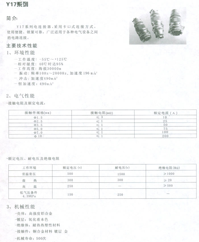一、Y17系列圓形電連接器(航空插頭)簡介 Y17系列電連接器,采用卡口式連接方式,使用便捷,鎖緊可靠,廣泛適用于各種電氣設備之間的電路連接。 二、主要技術性能1、環(huán)境技術性能