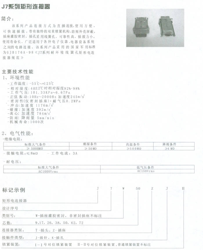 一、J7系列矩形電連接器(航空插頭)簡介 J7系列矩形電連接器(航空插頭)連接方式為直插連接,使用方便,可快速插拔,帶有獨特的雙重鎖緊機構(gòu),防雨外殼屏蔽,插座灌膠密封。插孔采用線簧孔,可靠性高,插拔力小,使用壽命長。廣泛適用于各種電子儀器、電器設(shè)備系統(tǒng)之間的電路連接。該系列產(chǎn)品采用的國家軍用標準為GJB176A—98《J7系列耐環(huán)境線簧孔矩形電連接器規(guī)范》