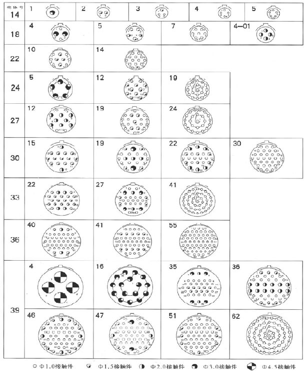 外殼間電連續性:≤2.5mΩ 機械性能 殼體:高強度鋁合金材料 非屏蔽鍍層:陽極氧化作色 屏蔽鍍層:鍍鋅彩虹色鈍化或軍綠色鈍化、化學鍍鎳 絕緣體:熱固性材料 接觸件:銅合金材料 表面鍍金、銀 封線體和密封圈:硅橡膠材料 機械壽命:1000次 標記代號及意義 ![]() 說明:1、表示整套電連接器時,標記代號采用分數形式,插座標記寫作分子,插頭標記寫作分母,中間用斜線隔開。 2、對于選配附件的插頭(座),可在其標記代號后加+再寫出所選附件。 注:該系列產品的外形尺寸與XC系列相同 XCG系列接點排列(裝針絕緣體插合面視圖) ![]() 更多詳情請咨詢:http://www.bjzztd.com | ||||||||||||||||||||||||||||||||||||||||||